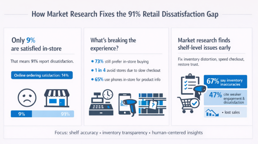 The numbers tell a clear story. Even in the more convenient context of online ordering, satisfaction levels remained stagnant at 14%. As digital integration raises the bar for personalization, physical retail is struggling with friction points, specifically inventory transparency and checkout velocity, that actively erode brand loyalty.